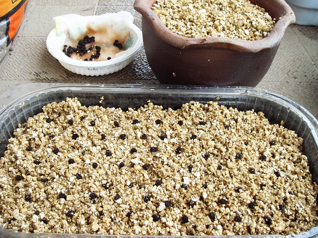 育苗容器以外にも、植え替えで失敗するリスクを回避するために直接鉢にも蒔いておくことにします。それでも余ってしまった種は、水に漬けたまま発根、発芽の様子を見守ってみることにします。