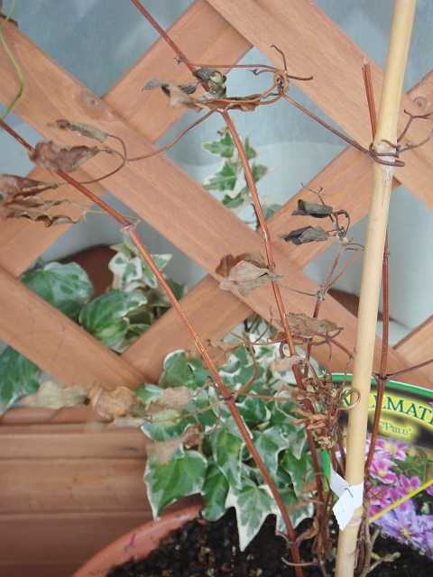 クレマチスの新芽や葉もぼろぼろになって、テッセン(かたい茎)だけになってしまいました。秋にまた咲くのを楽しみにしていたのですが、復活してくれるでしょうか。