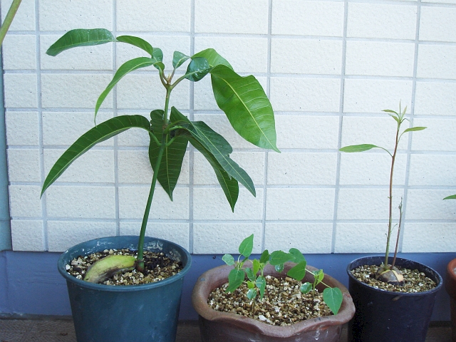 それでも、なんとか今年に食べて種を蒔いたトロピカルフルーツ達は元気に育ってくれています。左から、マンゴー、パパイヤ、アボカドです。