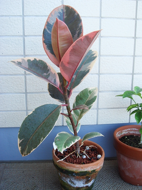 ゴムの木の鉢には、室内で蒸れたのか緑や白の藻かカビかわかりませんがびっしりと生えてしまいました。鉢の中が酸欠になったのか、四方八方から気根が生えてきてます。