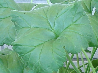 葉は丸っこく切れ込みはほとんどなく、少し光沢のあるしっとりすべすべした手触りです。