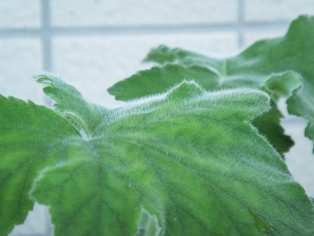 葉は浅い切れ込みで丸みのある手のひら形で、表面にびっしりと長めでやわらかい産毛のある、さわさわとした毛皮のような手触りです。まるでうさぎかなにかをなでているような感触です。【関連記事】