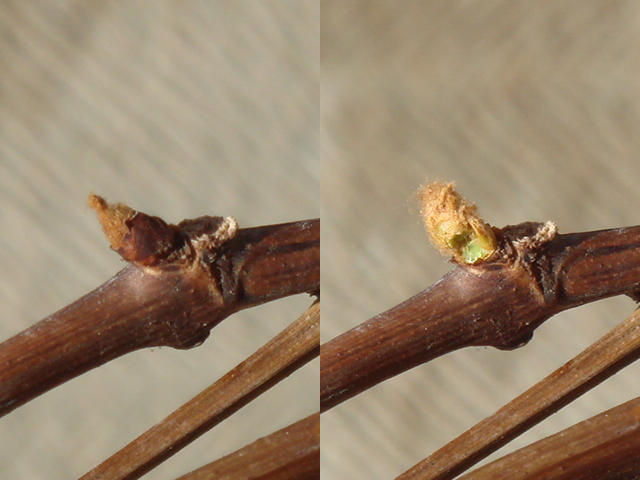 枯れているように見えて、枝にはちゃんと沢山新芽ができています。確認の為、剪定する枝の新芽を折ってみると中身は緑色でちゃんと生きているようです。