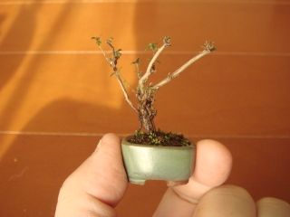 鉢の横幅は2cmくらいで、樹高は3cmほどです。2006年11月に苗を購入し育てていたコモンタイムを株分けして植えてみました。