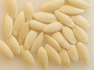 胡瓜の種はこんな形をしています。長さ1cm弱で、白くてやわらかい種です。