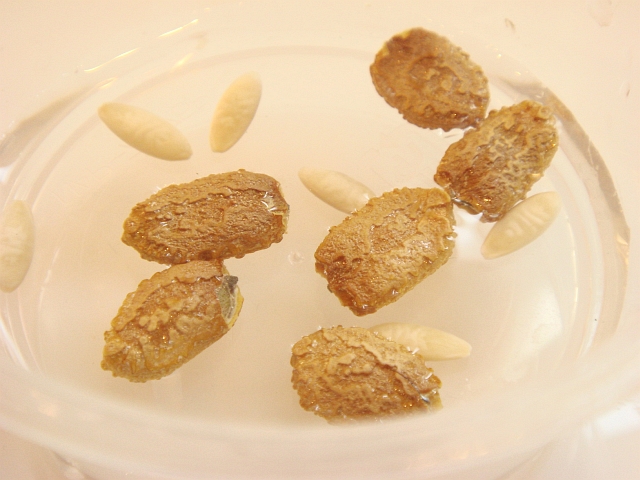 ゴーヤの種は、最初は浮いていますが徐々に水を吸って沈んできます。