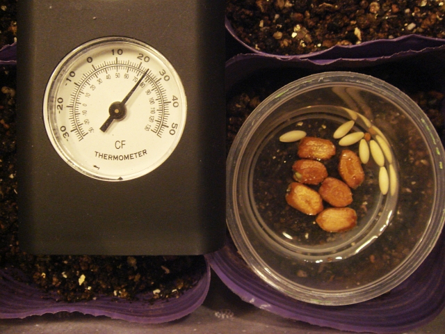 水に漬けて約1日経った種の加温を始めました。トロ箱の苗ポットに30度弱のぬるま湯をかけ、水に漬けた種を入れて蓋をし、暖房の効いた居間に置いておきます。