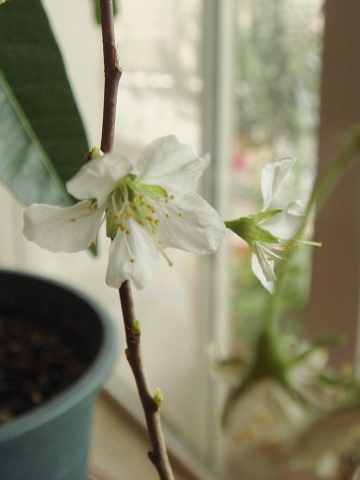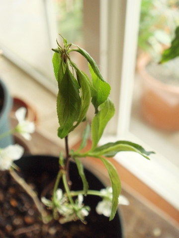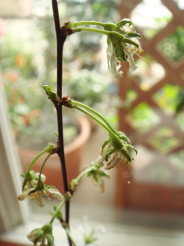 最後のほうに咲いた花はまだ元気です。葉の新芽も続々と出てきているのでなんとか無事に生きながらえてくれるかもしれませんが、今年の実はあきらめるしかないかもしれません...。
