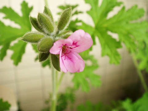 ローズゼラニウムの花が咲きました。2006年7月に苗を購入した、うちのセンテッドゼラニウムで最古参です。