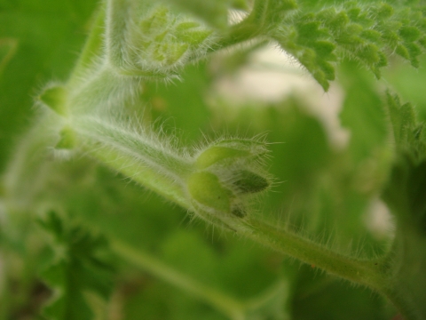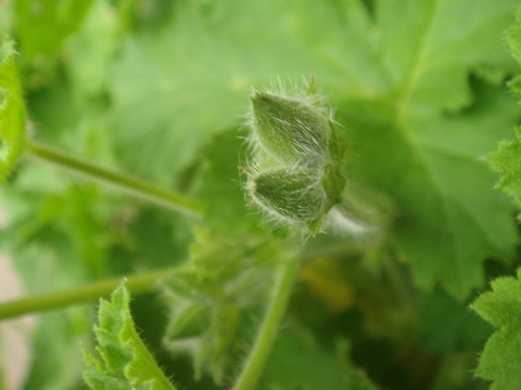 プリティーポーリーゼラニウムのつぼみです。濃い緑に太くて短い白い毛がびっしり生えてます。