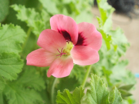大きさ2cm強で、センテッドゼラニウムにしては大きめな花です。ちょっとオレンジっぽいピンク色で、やさしい雰囲気の花です。