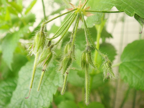ペパーミントゼラニウムの幼果です。下向きにトゲがぶら下がっています。