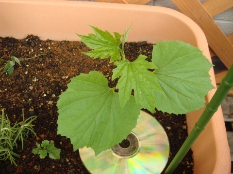 6/8の姿です。どうやらゴーヤっぽいという本葉を出しています。
