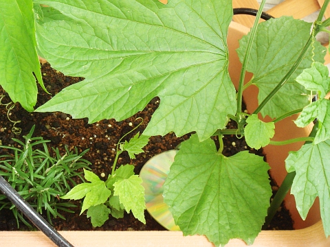 大きく成長した節成ゴーヤの隣に、とっても小さなゴーヤが生えてます。5月中旬に発芽したのですが、いまだに20cm程の高さのままのとっても矮性なゴーヤです。