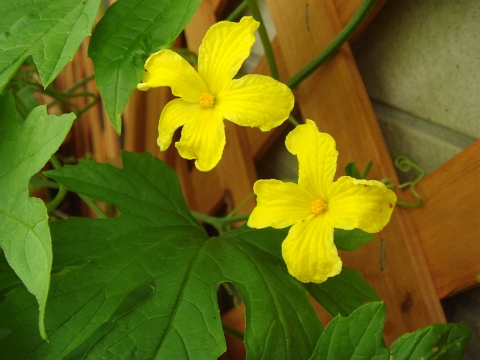 ゴーヤに初めての雄花(おばな)が咲きました。去年も6月下旬でしたので、ほぼ同じタイミングですね。