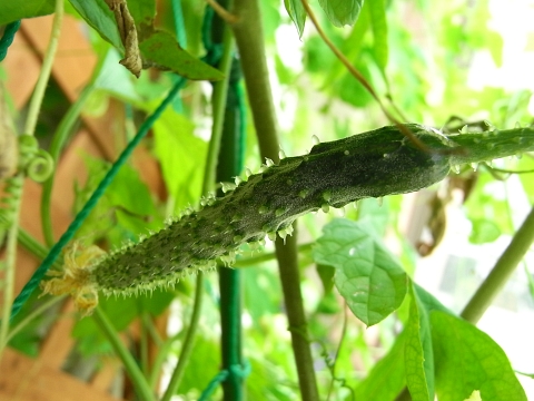 キュウリの小さめの実です。暑さに弱い胡瓜は、真夏の間は全く実をつけなくなりましたが、暑さも少し落ち着いてきた最近また実り始めました。