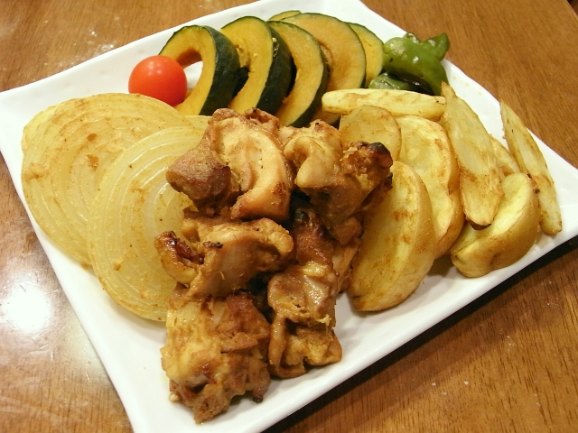 タンドリーチキン出来上がりです。ビタミン等保存メニューで仕上げたかぼちゃがうますぎです!