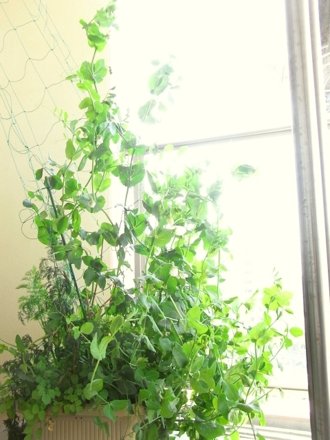 エンドウがどんどん巨大化してます。暴風でネットから引き剥がされたつるが、太陽を求めてネットと反対方向に育ち、垂れ下がってとても重そうな感じになってます...。