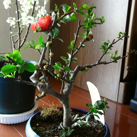 我が家のボケも開花しました。花芽を確認してから14週目です。