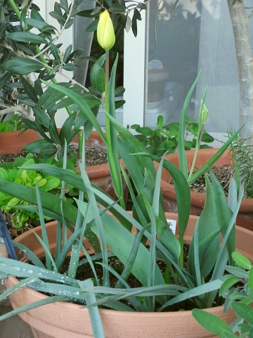 今年初めてのチューリップが咲きました。これは、咲く前日の姿です。