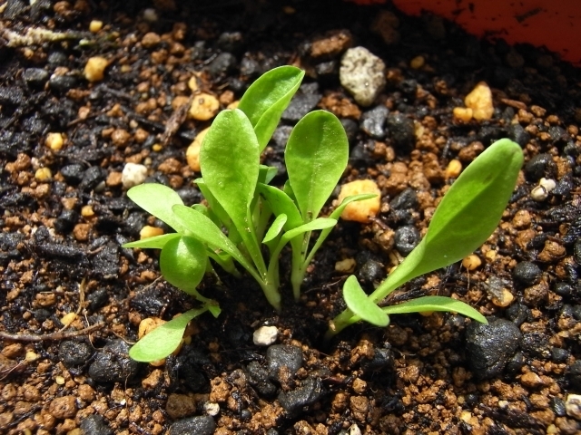 チコリが続々と発芽し、ちょっと密集しすぎです。趣味の園芸 やさいの時間で、チコリの種は1箇所に沢山まいてみんなで土を押し上げられるようにすると言っていたので、それに従ってみました。