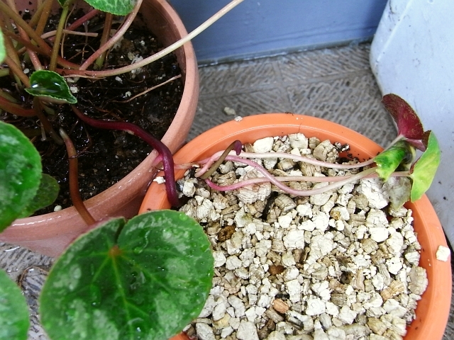 隣に鉢を置いて、ランナーの先を埋めてみました。シクラメンの生産は通常種や組織培養でするらしいです。
