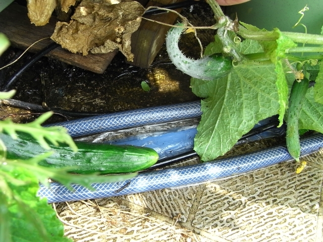 収穫しました。地這いになっていたきゅうりの方は、曲がり気味ではありますがいい感じの細長さですね。