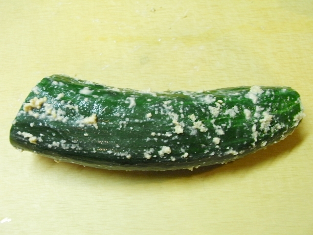 キュウリをぬかに漬け込んで、夏は冷蔵庫で24時間ほどでちょうどよい感じに漬かってます。冬は室温で使ってます。