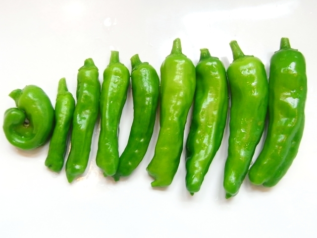 シシトウを収穫しました。小さなものから大きなものまで、そして丸まったものまで、色々ですねー。