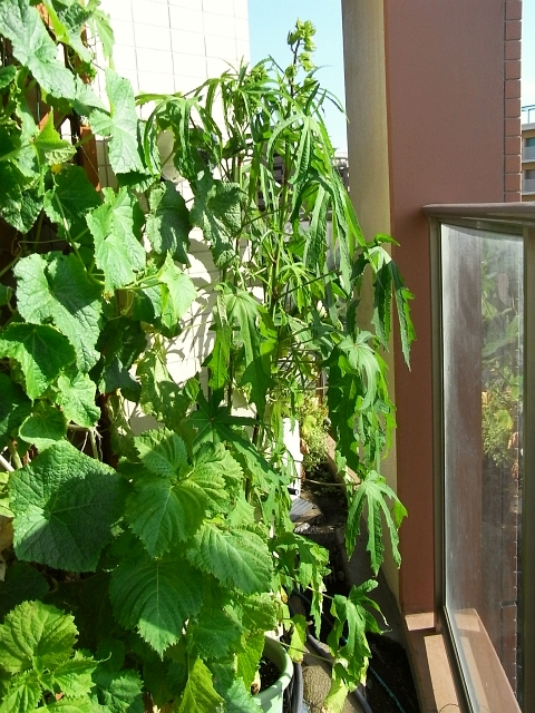 花オクラ(トロロアオイ)の種が発芽して10週間ほど経ちました。高さはとうとう140cmに達しました。