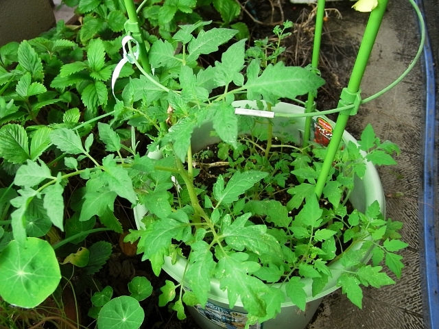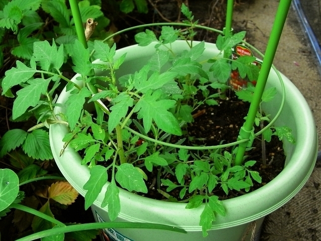 そのプランターの株元に、こぼれ種ミニトマトが発芽して育っています。発芽後3週間ほどの姿です。