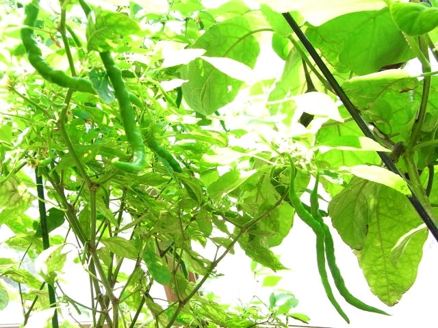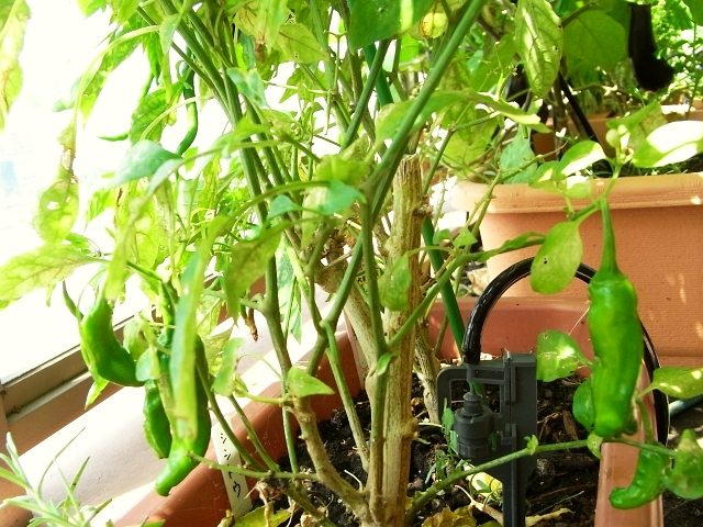 ししとうの実です。去年育てていたシシトウが越冬し、2年目も実をつけてくれています。