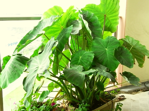 植え付け5ヶ月の里芋です。ずっと天候不順だったせいか、去年の今頃に比べるとかなり心もとない感じです...。