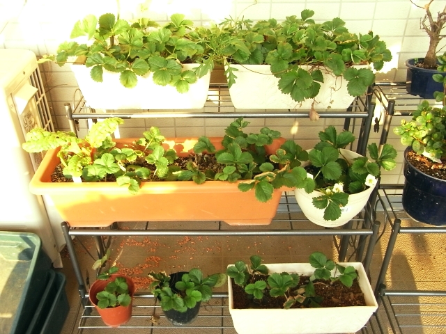 女峰は1株から増えて今12株。その他を入れて24株ほどあります。四季成りのセリーヌだけ増えない(実もつけない)ので、違うのをやってみようかと思っています。ランナーが出ると切るのももったいなく思うのは素人根性で、結構ポットで拾っています。毎年人にあげたり弱そうなのを処分したり。で、スペースがあるだけ残しています。