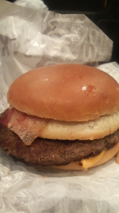 クォーターパウンダーのパティとチーズにベーコン二枚とフライドオニオン、真ん中にもバンズが挟まってました。