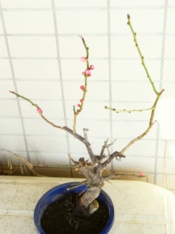 昨年2009年3月に、湯島天神の梅まつりで買いました。実は花のあとの夏にすべての葉が一旦枯れてしまいましたが、その後また新芽が出て復活してくれました。