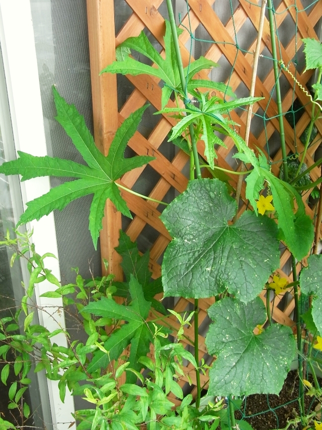 越冬して2年目の花オクラも、キュウリの陰でどんどん高く育っています。今後の生長が楽しみです。