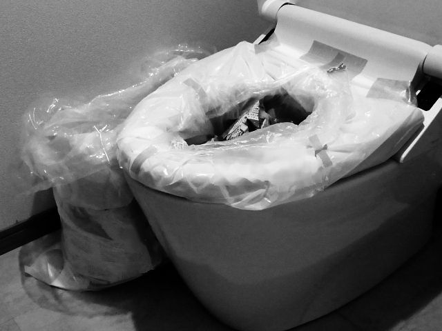 一番つらいのがトイレです。二重にしたビニール袋に新聞紙等を敷き、使用後は内側の袋をしっかり縛って別のゴミ袋に移し変えて、1日〜2日たまったら捨てに行きます。
