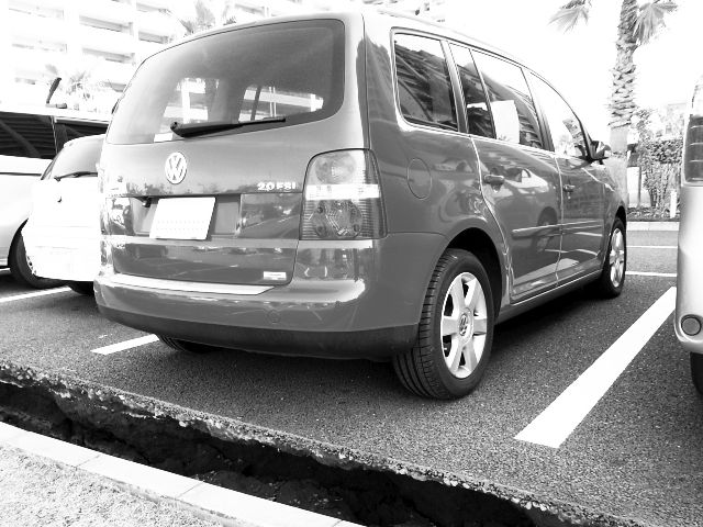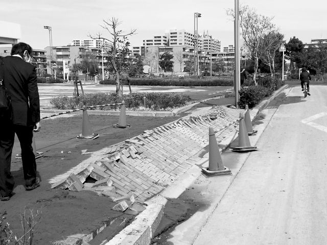 液状化で泥水が吹き上げ、歩道は波打ち、駐車場は陥没しました。