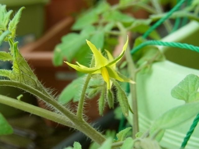 こぼれ種で勝手に生えてきた品種不明のミニトマトも花が咲き始めました。