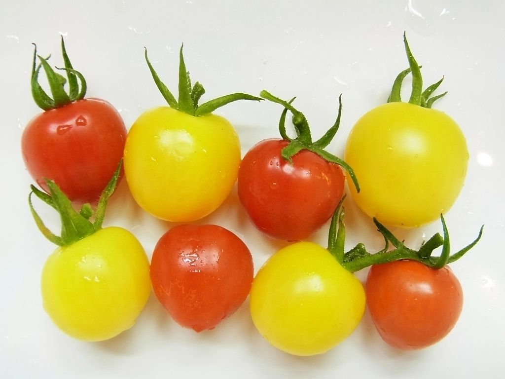 赤い「トマトベリーガーデン」と黄色い「アイスレモン」という品種のミニトマトです。(台風前の写真です...)