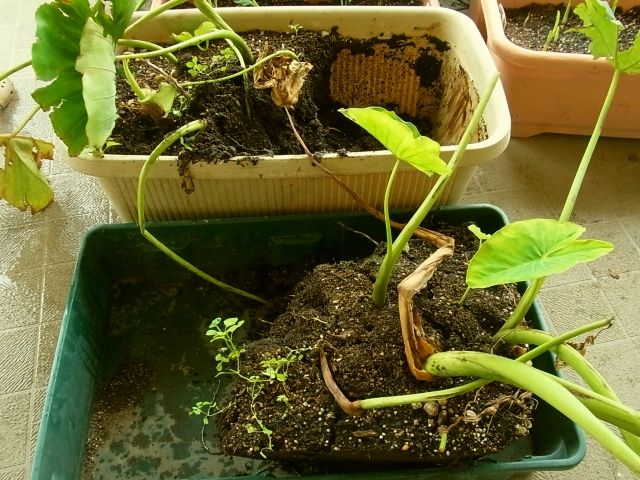 6月初めに3つの里芋を、幅70×奥行40×高さ26cmの大きめの野菜用プランターに植え付けて育てました。