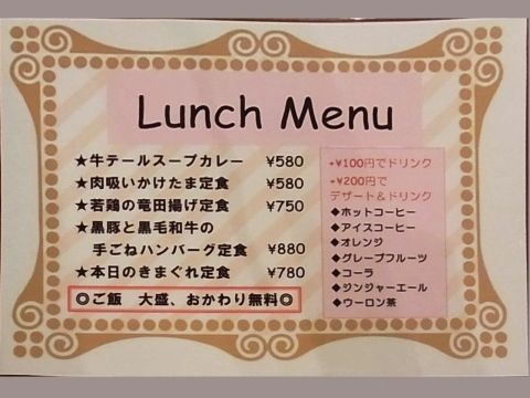 ランチは、他にも鉄鍋牛テールスープカレーや肉吸いかけたま定食、若鶏の竜田揚げ定食、本日のきまぐれ定食があります。