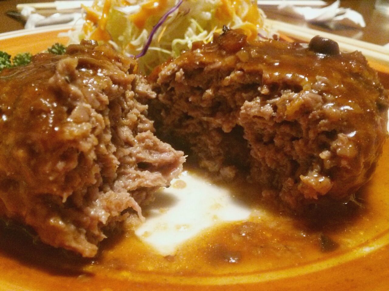 割ってみるとこんな感じで、無駄に肉汁が流れ出したりはしませんが、ジューシーで味わい深い肉の旨みをたっぷり感じるハンバーグです。